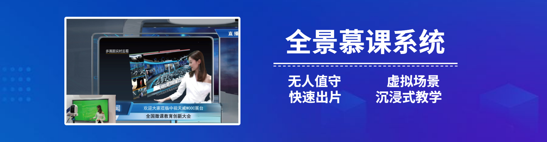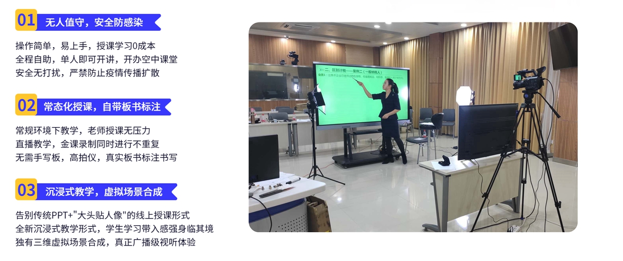 微课程制作系统适合不需要大空间拍摄教学视频的环境,利用抠像技术,配合教师准备的数字教材,就可以将教师人像结合教学所需的场景,任意创作。