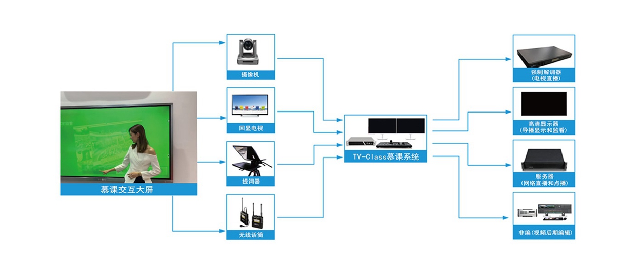 慕课制作系统是利用TV-Class高清慕课主机配合专用高清摄像机设备进行慕课视频的拍摄记录,配合触控大屏、显示屏、抠像灯光设备进行慕课视频的拍摄记录,系统拓扑图如下图所示。