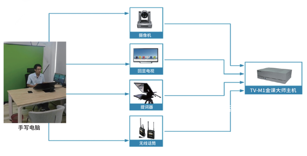 金课大师是利用TV-M1高清慕课主机配合专用高清摄像机设备进行课件视频的拍摄记录,配合抠像绿布、手写电脑、显示屏、抠像灯光设备进行视频的拍摄记录,系统拓扑图如下图所示。